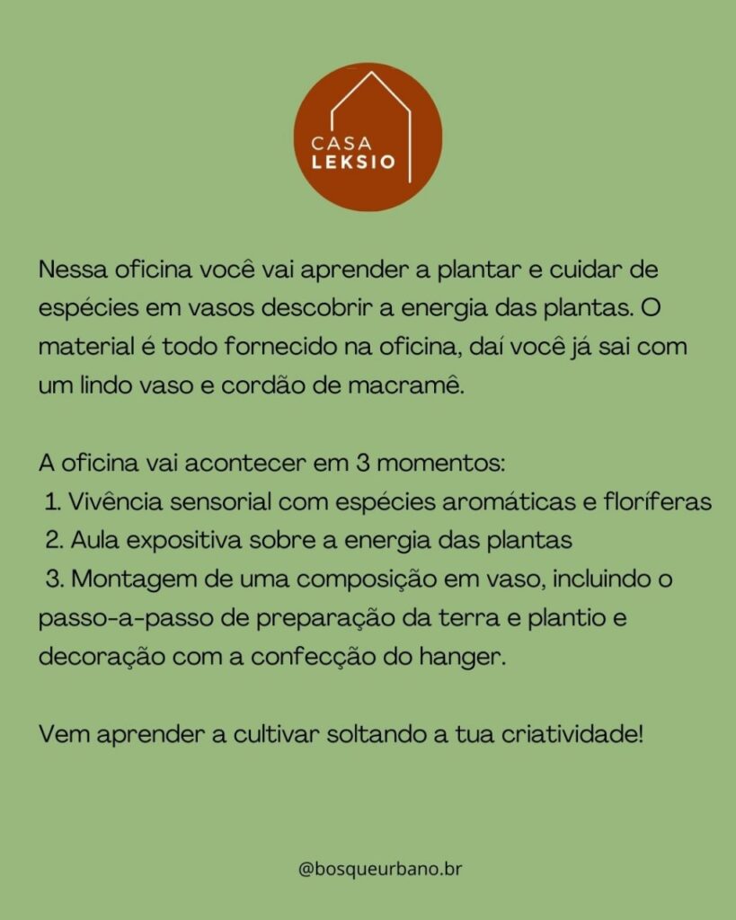 A oficina vai acontecer em 3 momentos: 1. Vivência sensorial com espécies aromáticas e floríferas 2. Aula expositiva sobre a energia das plantas 3. Montagem de uma composição em vaso, incluindo o passo-a-passo de preparação da terra e plantio e decoração com a confecção do hanger * materiais: cada participante recebe vaso plantado em aula com uma planta e material para confecção do hanger Vem aprender a cultivar soltando a tua criatividade!